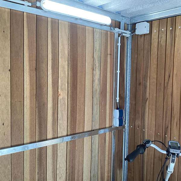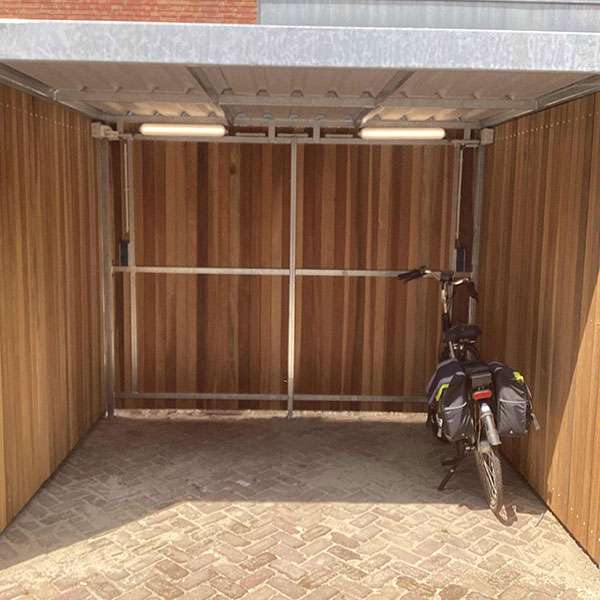 De nieuwe overkapping die geplaatst is op het buitenterrein van de Eeshof naast de bestaande overkapping is bestemd om fietsen en scootmobiels in te parkeren en als extra berging. Deze nieuwe overkapping heeft maar liefst een breedte van 10 meter en is onderverdeeld in drie compartimenten. Het middels gedeelte van de overkapping is open, zonder voorwand. De buitenste delen zijn afsluitbaar middels een deur. De deur voor het gedeelte waar de scootmobiels geparkeerd kunnen worden is extra breed en voorzien van een deurdranger met elektrische dagschootontgrendelaar.